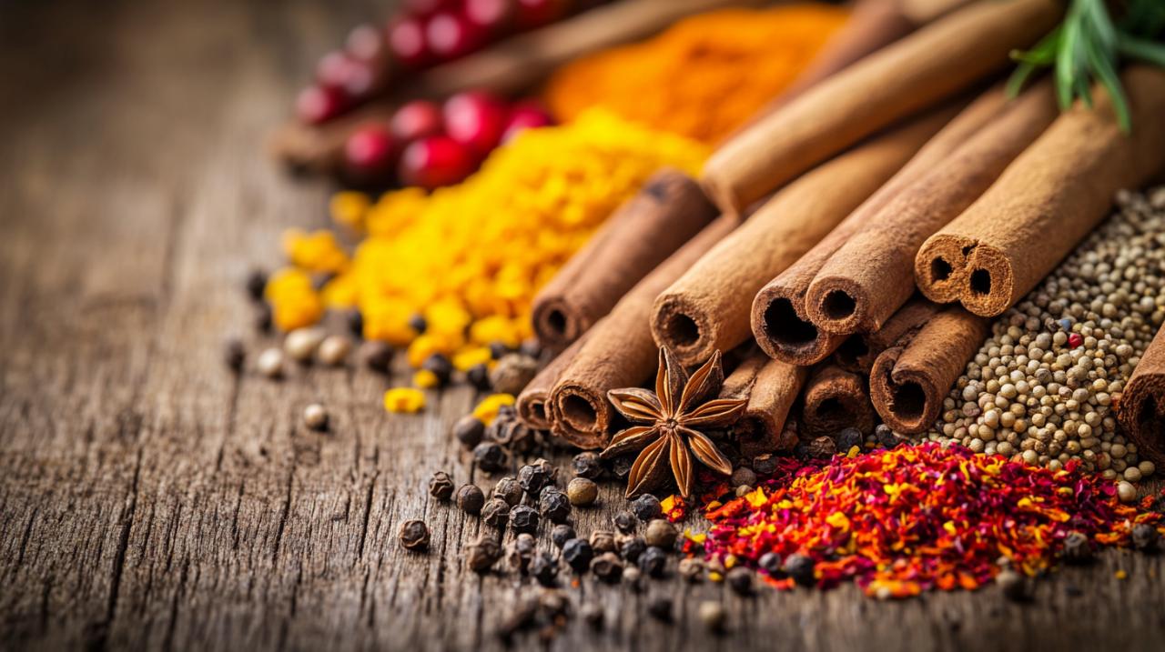 L'univers aromatique des épices constitue une palette infinie de possibilités pour le cuisinier créatif. Parmi les incontournables, le poivre noir offre sa note piquante caractéristique, tandis que le cumin déploie des arômes terreux et légèrement amers. Le paprika apporte sa douceur colorée, le curcuma sa teinte dorée et ses propriétés anti-inflammatoires reconnues, et la coriandre ses notes fraîches et citronnées. La cannelle, avec sa capacité à réguler la glycémie, enchante autant les préparations sucrées que salées, pendant que le gingembre réchauffe avec son caractère légèrement citronné et épicé.